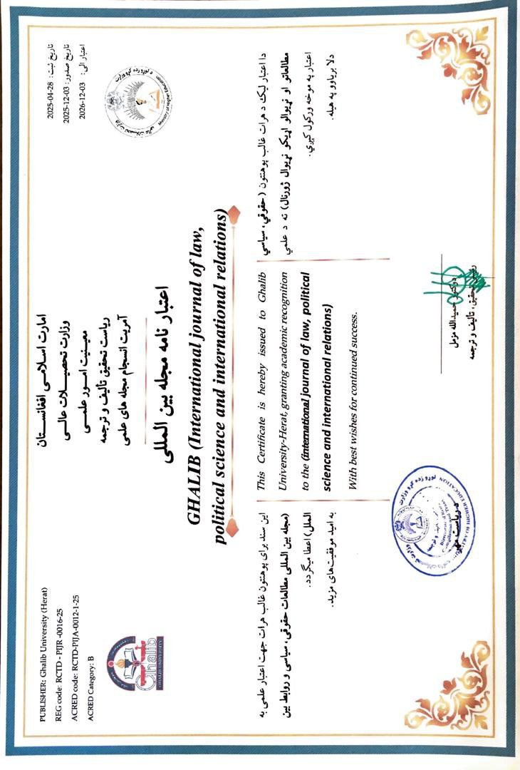 فصلنامۀ علمی - پژوهشی غالب، با جواز رسمی از وزارت تحصیلات عالی افغانستان، از خزان ۱۳۹۱، در دو حوزۀ علوم طبیعی و علوم اجتماعی، مقالات علمی - پژوهشی نویسندهگان کشور و خارجی را چاپ و نشر مینمود؛ و از شمارۀ زمستان ۱۴۰۱، تنها مقالات علمی - پژوهشی را در حوزۀ علوم اجتماعی (با تمرکز بر حقوق و علوم سیاسی، ادبیات، اقتصاد و مدیریت، جامعهشناسی و شرعیات و علوم اسلامی) منتشر مینمود. این نشریه از شمارۀ زمستان ۱۴۰۳، محدودۀ موضوعی خود را به حقوق، علوم سیاسی و روابط بینالملل کوچک نمود. اینک این نشریه (غالب) به عنوان مجلۀ بینالمللی مطالعاتِ حقوقی، سیاسی و روابط بینالملل شناخته میشود. این نشریه دارای شماره استاندارد بینالمللی آنلاین (۶۴۴۱-۲۷۸۸) و چاپی (۴۱۵۵-۲۷۸۸) است و تمام قوانین و مقررات انتشار مقالههای علمی - پژوهشیِ داخلی و بینالمللی را رعایت مینماید.